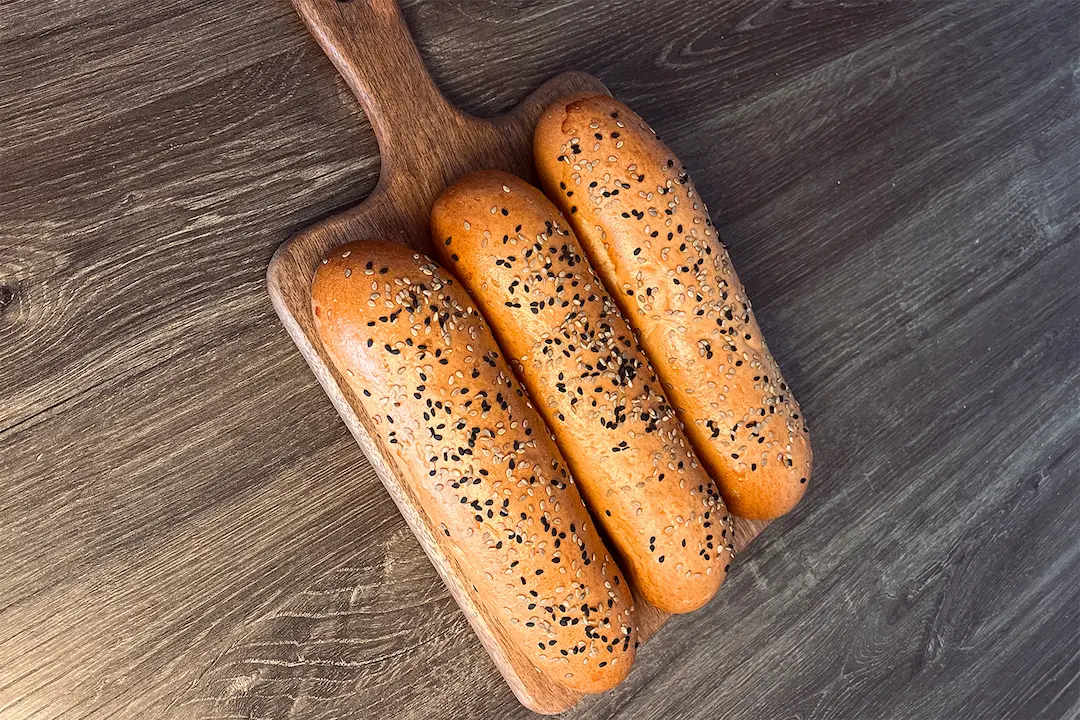 Nuestro pan de hot dog está hecho con la misma masa enriquecida de nuestros brioches, utilizando mantequilla de Cajamarca para lograr una miga suave, dorada y ligeramente dulce. Su estructura es lo suficientemente firme para soportar todas las salsas, papitas y toppings que quieras ponerle, sin romperse ni humedecerse en exceso.