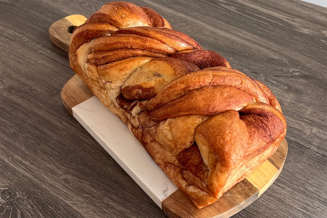 Imposible comer solo una rebanada. Tomamos nuestra masa más suave y la trenzamos a mano con capas abundantes de canela selecta y azúcar rubia. Al hornearse, el relleno se carameliza creando vetas húmedas y pegajosas que recorren todo el pan, mientras la corteza queda dorada y brillante.